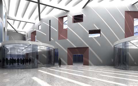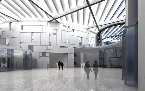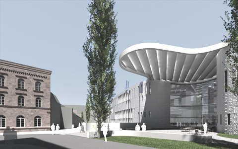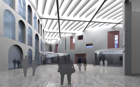 Die drei Gebäude geben durch Ihre verschiedenen Gesichter Hinweis auf Ihre Eigenständigkeit aber auch darauf, dass Sie allesamt den Zeugnissen der Vergangenheit verpflichtet sind. Erst der gemeinsame Kontext, in dem sich die drei Institute gegenüber stehen, in einer halböffentlichen Halle musealen Charakters, erlaubt die Hingabe zu einer Zitat-reicheren Darstellung, als es im öffentlichen Außenraum möglich wäre. Trotz aller Eigenständigkeit wird eine starke funktionale Verwobenheit durch das Forum und über Brücken durch Selbes hergestellt. Das Forum als Innenraum und alle Institute unter einem Dach machen die erwünschte Symbiose möglich ohne, dass die Institute Ihre Eigenständigkeit verlieren. |