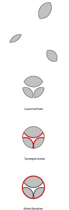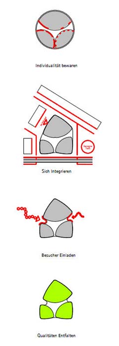 Obgleich die drei Institute durch den gemeinsamen Hintergrund sehr verwand sind, möchten sie dennoch Ihre Individualität nicht einbüßen, sondern mit- und nebeneinander existieren. Der Auftritt nach Außen soll gemeinsam stattfinden, um einen kulturellen Schwerpunkt für das südliche Mainz bilden zu können. Im Inneren sollen die drei Institute auch nach der Vereinigung eigenständig ablesbar bleiben. |