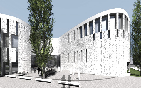 G E M E I N S A M E R A U F T R I T T Nach Außen zeigt sich das AZM als geeintes Großinstitut. Ein geschwungenes Band umfasst die enthaltenen Institute und fasst die einzelnen Baukörper zu einer großen Figur zusammen. Es hat die Besonderheit und Aussagekraft, die man von einem Museum erwartet. Leistet gleichzeitig aber auch, den Perforationsgrad aufzuweisen, der nötig ist, um nichtmusealen Nutzungen, wie z.B. Forschungslaboren und Werkstätten, das nötige Tageslicht zu bieten. Es auf die Anforderungen im Inneren optimal angepasst.