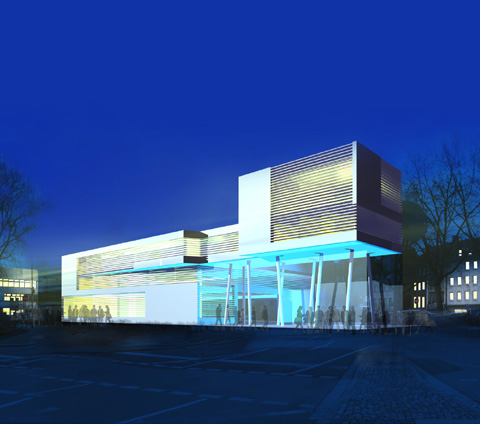 Neue V O L K S H O C H S C H U L E Neuss Im April 2007 konzipierten wir eine Überbauung der zuvor aufgefundenen römischen Ausgrabungsstätte entlang der Hymgasse. Die Neusser Politik dachte zur gleichen Zeit über einen neuen gemeinsamen Schulbau für die Musikschule und die Volkshochschule nach. Die Idee war nun, einen Schulbau zu konzipieren, der in Teilbereichen über der Ausgrabungsstätte aufgeständert ist, sodass die römischen Funde sichtbarer Teil des Foyers werden können. Beispielsweise durch Überdeckung mit begehbaren Gläsern.