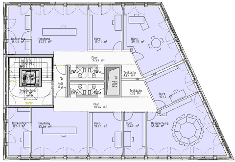 Das Grundriss-Layout ist auf eine maximale Ausbeute vermietbarer Flächen nach GIF ausgelegt. Pro Etage sind zwei Mieteinheiten organisierbar. Bei nur einer Mieteinheit pro Etage entsteht ein kompletter Umlauf um die in der Dunkelzone gelegenen Kernflächen. Das Treppenhaus mit Aufzug ist zu der bereits bestehenden Anschluss-Bebauung hin orientiert. Die Fassade und der Innenausbau basieren auf einem Ausbauraster von 135 cm. In jeder Fassadenachse ist ein Trennwandanschluss an die Fassade möglich. |