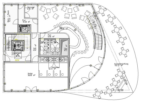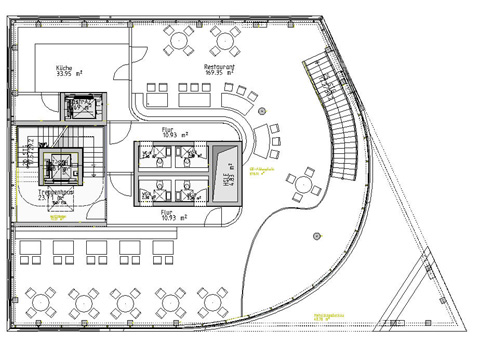 R A U M F L U S S Die unteren Etagen, welche eine Gastronomie und eine Butike enthalten, unterscheiden sich von den Bürogrundrissen der aufgehenden Etagen grundsätzlich. Statt orthogonaler Optimierung einer Büroorganisation, herrscht hier im Innenraum freier Formenfluss, der seinen Ursprung in städtebaulichen Überlegungen hat. Der teils zweigeschossige Raum enthält einen rund geformten Treppenaufgang in die zweite Ebene. Die Galeriebrüstung der oberen Ebene ist wellenhaft geformt. Die Gestaltung von Theke und Sitzmobiliar passt sich den runden Formen an. |